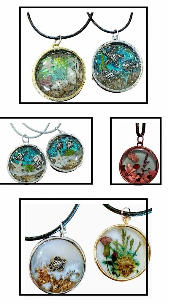 Come join us for a fun and creative **jewelry-making** experience in this in-person workshop led by the talented Janie! In this class, you'll learn how to create THREE beautiful **open bezel** pendants (for just $45), using various techniques and materials such as dried flowers, coastal charms, sand, etc. You will select from silver or goldtone bezels, as well as a colored cord to complement your pendant.