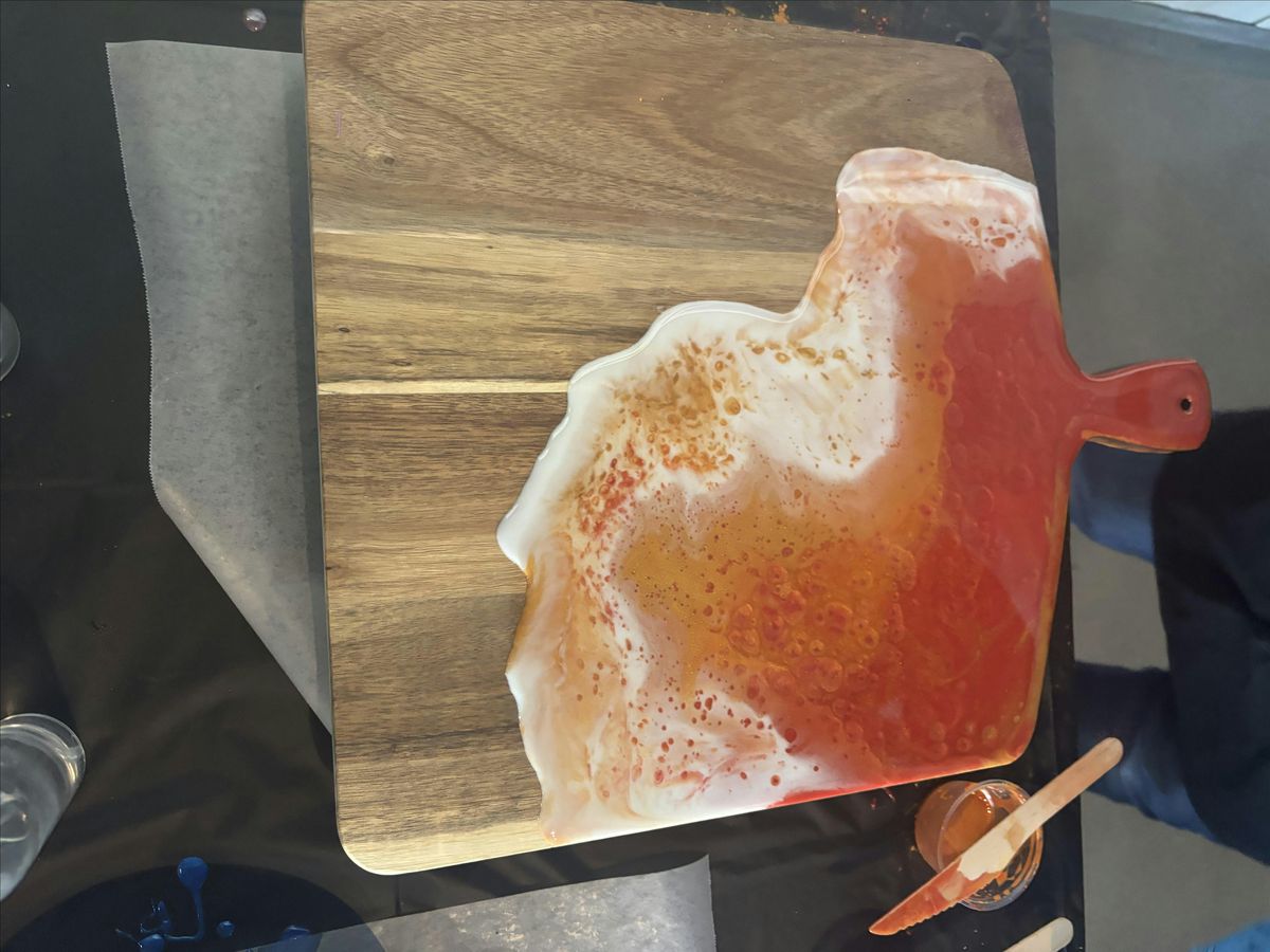 During this experience you will learn how to mix it, tint it and create resin ocean seascapes on a Charcuterie board that you can take home with you. You'll leave with an impressive work of art 🎨 to show off to friends and have a great time making it. The boards come in different shades, arrive early so you can pick the masterpiece that fits you best.There will be plenty of colors to choose from.