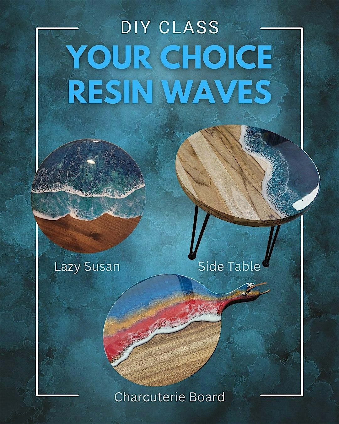 Create a Resin Wave Charcuterie Board OR a Resin Wave Side Table OR a Resin Wave Lazy Susan with local artist George Todd. All materials are included. Sign up with a friend for an unforgettable experience! The side table is 16" total (1" thick resin board with black metal hairpin legs).