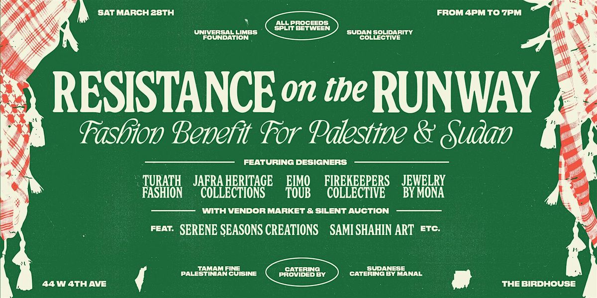 Join us for a beautiful night of fashion, joy, resistance, and solidarity! Full runway featuring Palestinian and Sudanese designers: Turath Fashion, Jafra Heritage Collections, Firekeepers Collective, Eimo Toub and Sudanese Jewelry by Mona. Catering by Tamam Fine Palestinian Cuisine and Manal’s Sudanese Cuisine. Market featuring work by all designers, in addition to Sami Shahin Art, and Serene Seasons Creations. Silent Auction with donated items from local artisans and businesses. Funds distributed equally between our partners - Universal Limbs Foundation and Sudan Solidarity Collective. Please find information about these organizations at the sites below. We look forward to uplifting local designers and businesses that are members of the communities directly impacted by these conflicts. Their work is resistance in action!