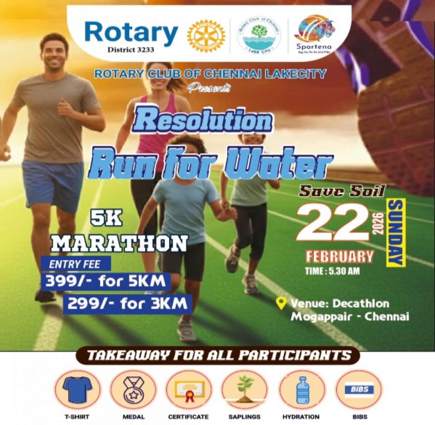 Join the Remarkable Edition of RESOLUTION RUN FOR WATER & SAVE WATER presented by Sportena Academy & Rotary Club of Chennai Lake city.