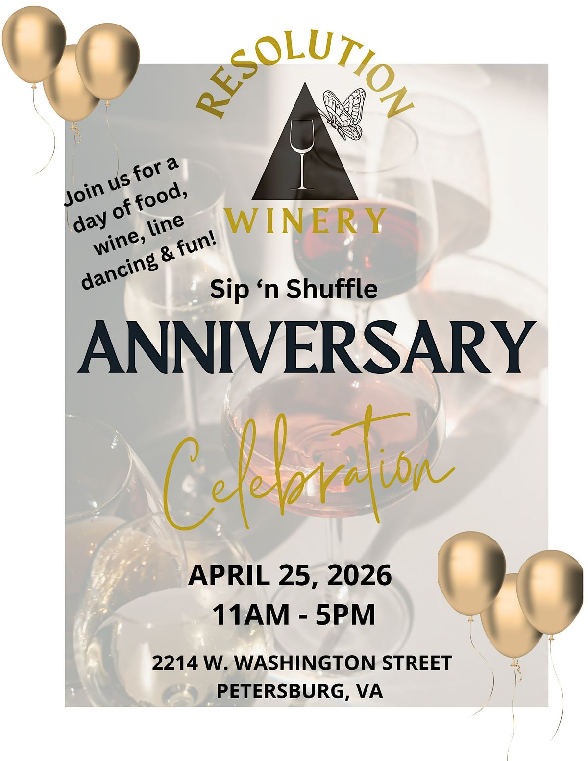 Come join us at Resolution Winery as we celebrate 3 years of crafting memorable experiences right here in Petersburg, Va. Prepare yourself for an unforgettable day at Resolution Winery! Our Sip n Shuffle event promises a day filled with delightful wines and lively dancing. Whether you're a seasoned dancer or just looking to have some fun, this event is perfect for everyone. Don't miss out on this unique experience – join us and make some wonderful memories.