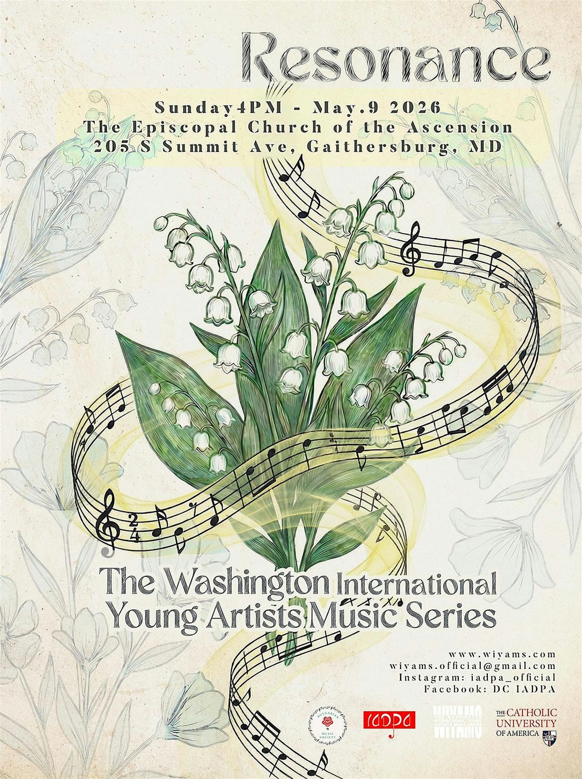 The second concert of the 2026 Washington International Young Artists Music Series, Resonance, warmly invites you to an evening of vibrant and expressive music brought to life by an exceptional group of emerging artists. Featuring works by Ludwig van Beethoven, Frédéric Chopin, Sergei Prokofiev, and Alberto Ginastera, alongside music by Erik Satie, Isaac Albéniz, Enrique Granados, Margaret Bonds, and Georges Aperghis, the program offers something for every listener to enjoy. Join us at The Episcopal Church of the Ascension, 205 S Summit Ave, Gaithersburg, MD 20877. Tickets are $25 for adults, and children 6-12 attend free. Stay after the concert for a complimentary reception where you can meet the performers, share your impressions, and be part of a welcoming musical community.
