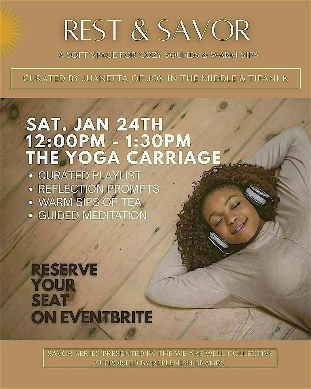 Tifani K and Juanetta of Joy In The Middle are holding space for us to gently transition into the New Year. Prepare for mindful listening to a curated list, tea tasting, meditation, reflection and connection. Juanetta is a Joy Curator and Social Service professional holding space for women on their healing journey. Presented by the We Are Well Collective, supported by Replenish Brands.