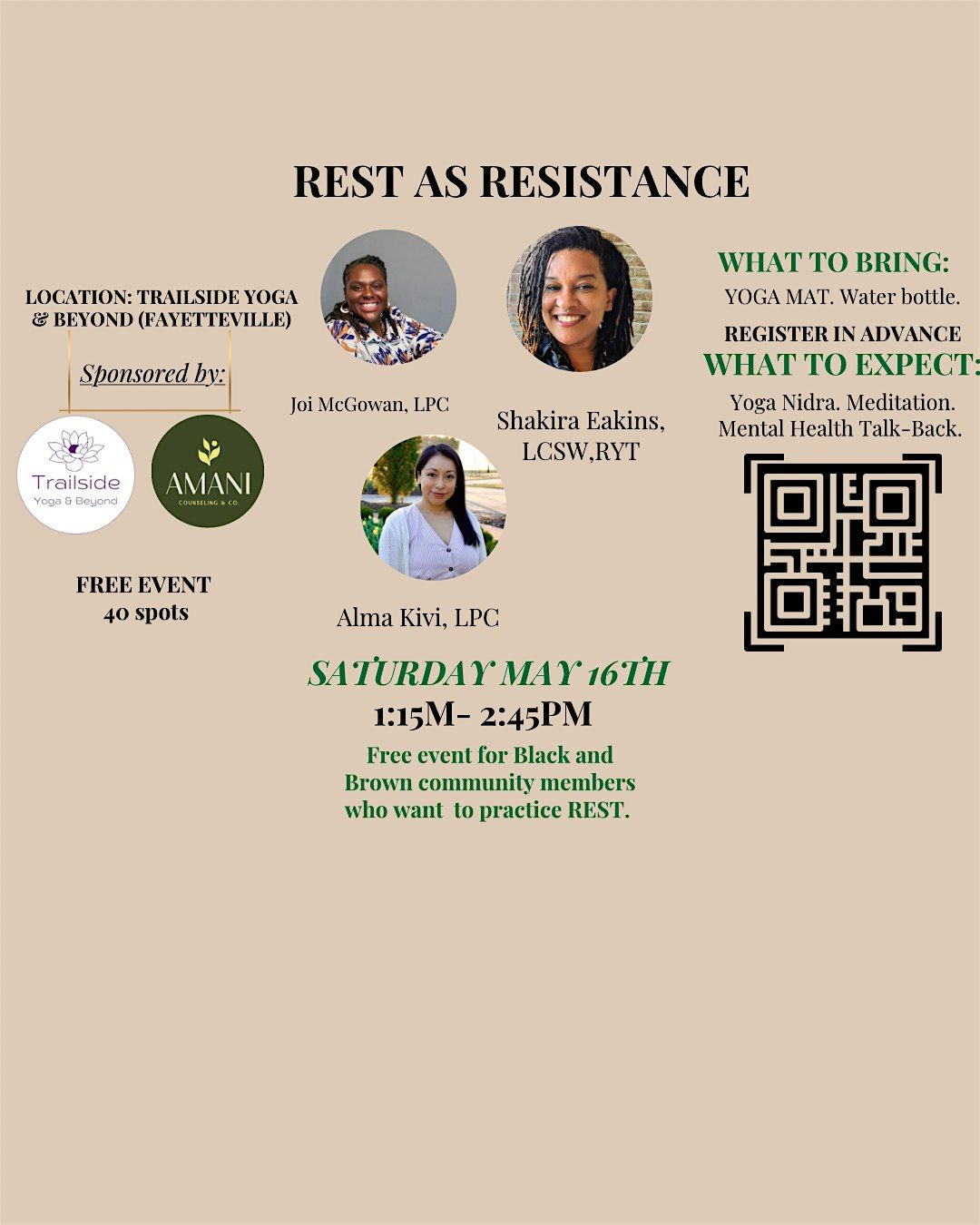 This FREE event is all about promoting practical ways for Black and Brown community members to practice rest. This event is led by Shakira Eakins, LCSW, RYT, Joi McGowan, LPC, and Alma Kivi, LPC.
