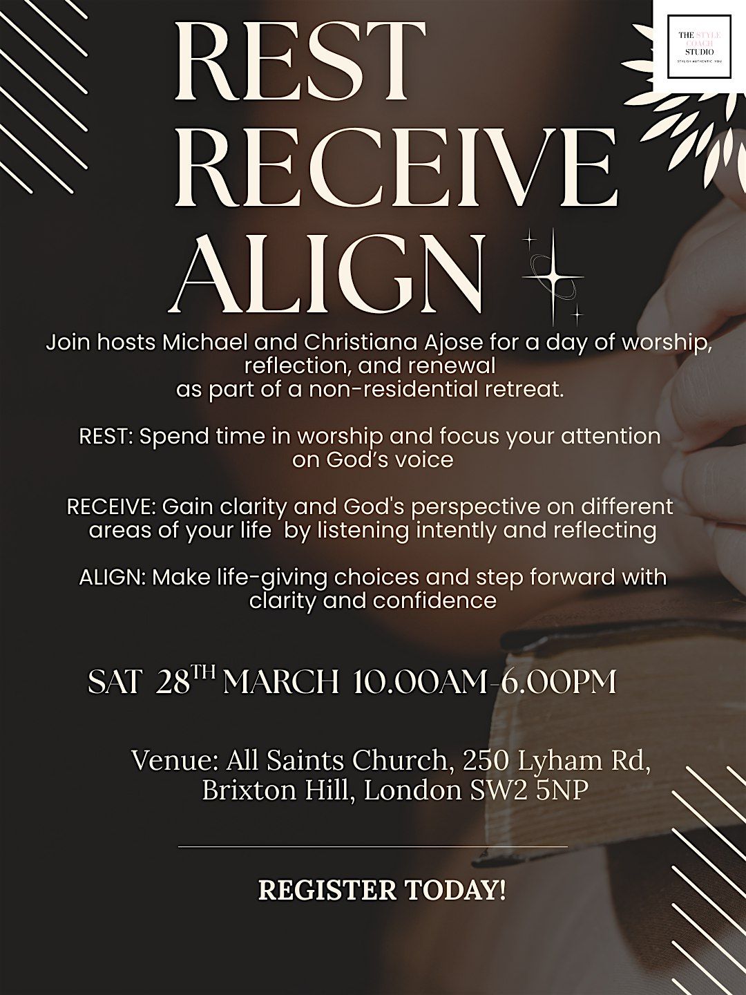 Join the hosts Christiana and Michael Ajose for a refreshing time to rest, re-orient your mind, and find clarity in God's presence. This in-person event is all about taking a break from the hustle and connecting with God in a relaxed and welcoming space. Come as you are and leave feeling renewed! Light refreshments will be provided. Please bring a notebook and pen with you.