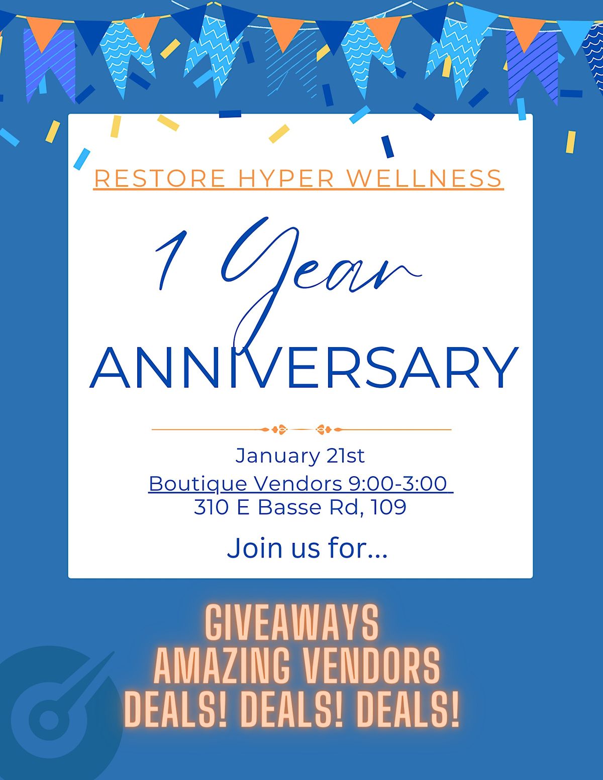 Come celebrate Restore Hyper Wellness-Quarry's 1 year anniversary! Join us for amazing promotions, fabulous boutique vendors and raffel prizes sponsered by our partners. You won't want to miss this party of the year. Call to schedule your service as appointment times may be limited!