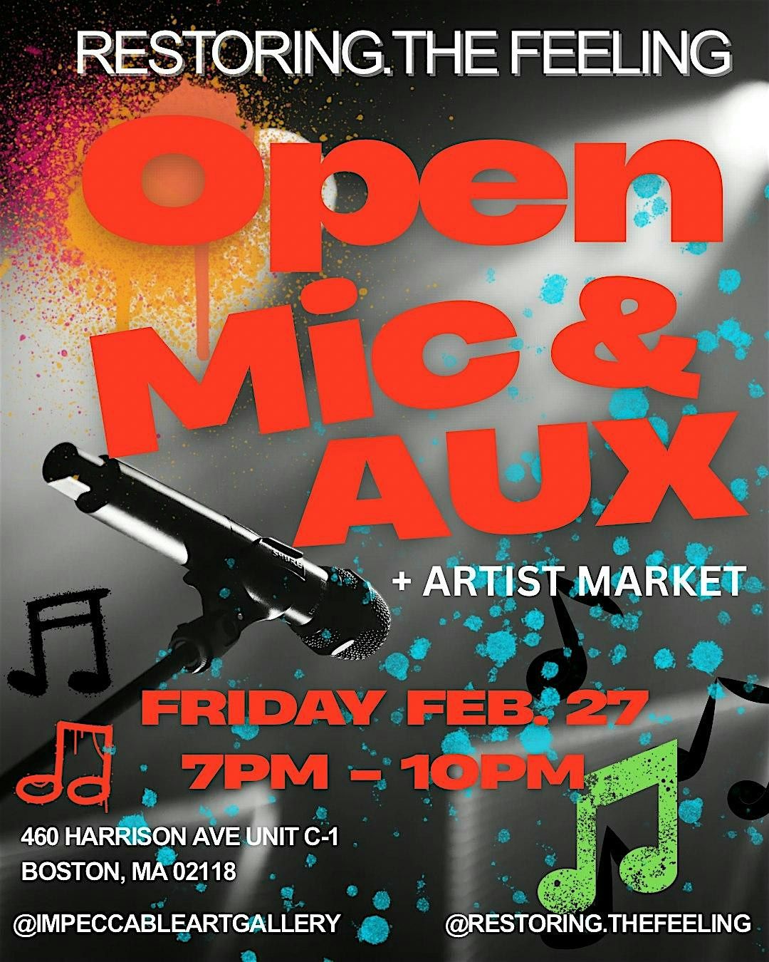 Friday Feb. 27 @restoring.thefeeling is hosting Open Mic and AUX + an Artist Market! Don't Miss the Great Music & Vibes!About this Event