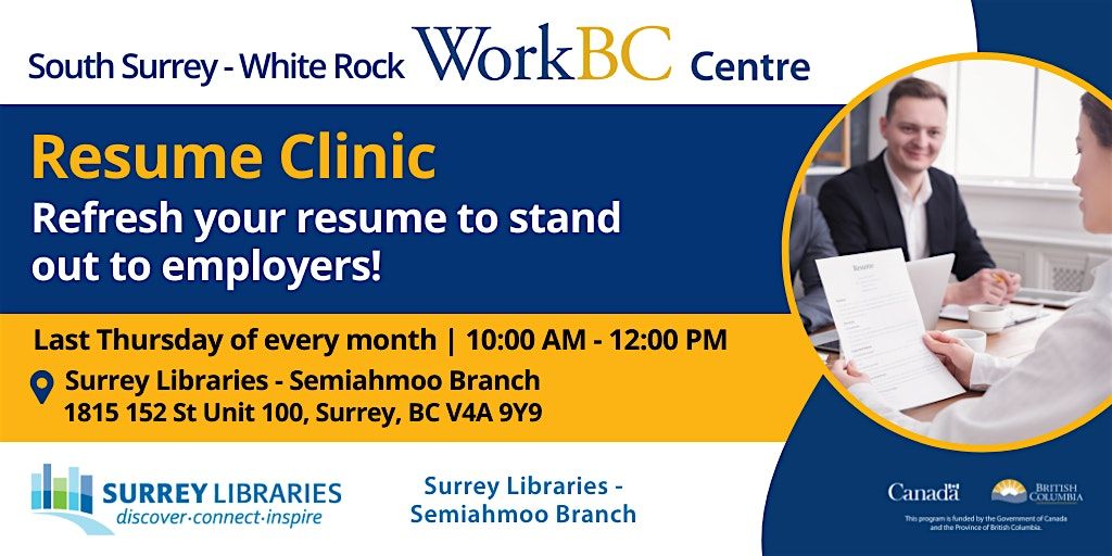 Welcome to the Resume Clinic at Semiahmoo Branch! Join us for a personalized session to spruce up your resume. Our experts will provide tips and tricks to make your resume stand out to potential employers. Whether you're just starting out or looking to make a career change, this event is perfect for anyone wanting to polish their resume. Don't miss this opportunity to boost your job prospects!
