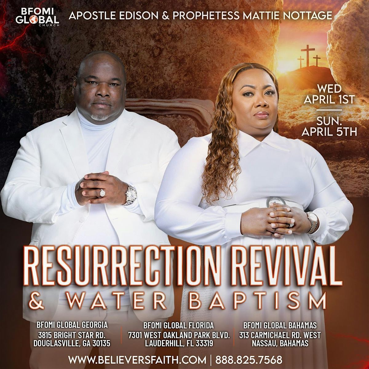 JOIN APOSTLE EDISON AND PROPHETESS MATTIE NOTTAGE FOR THE RESURRECTION REVIVAL WEEKEND STARTING WEDNESDAY APRIL 1ST @ 7:30 PM THROUGH SUNDAY APRIL 5TH @ 10:00 AM.