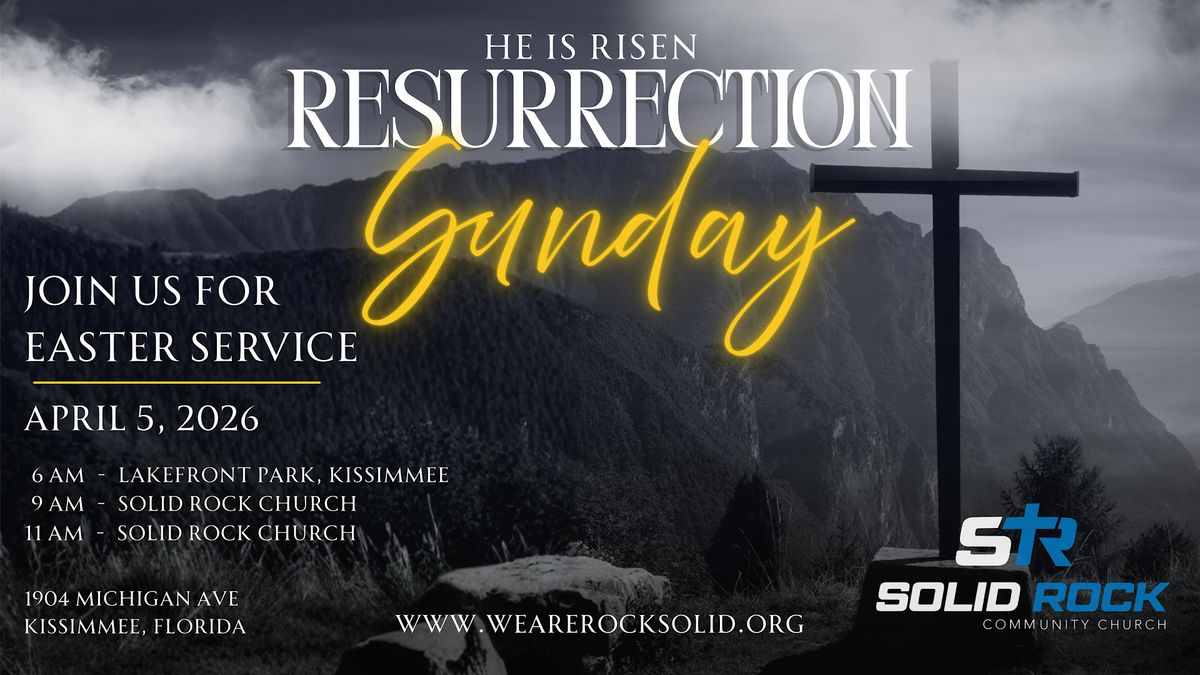 He Is Risen. Join Solid Rock Community Church as we celebrate the Resurrection of Jesus Christ with three powerful worship services on Resurrection Sunday, April 5, 2026.
