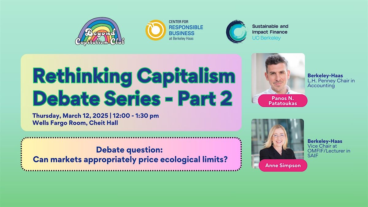 Finance says it can price anything, but can it price the planet? The real social cost of carbon may be hundreds of dollars per ton, yet most companies pay next to nothing. Join us for a debate between two Haas Professors about whether markets can internalize ecological limits or whether we need something entirely different. Come for the entertainment, stay for the fiduciary duty.