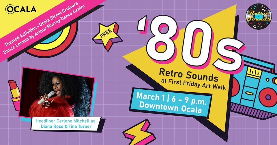 Each March, First Friday Art Walk travels back in time with Retro Sounds! Retro Sounds pays homage to the generations of past musical genres and performers. The evening features a musical performance by professional tribute artists and bands. Travel back through the decades and hear all your favorite hits!On March 1, 2024, we’re going back to the 1980s. MTV, Hip Hop, big hair, and the beginning of the digital era! The evening will begin with an instructed dance lesson by Arthur Murray Dance Center on the Square from 6 – 7 p.m. and then continue with a two-hour 1980’s Queen Divas Tribute performance by the stellar Carlene Mitchell with a special Janet Jackson intermission by her daughter. From Tina Turner to Diana Ross, Carlene Mitchell will emulate these iconic 1980’s female performers with her inspired energy and undeniable voice!