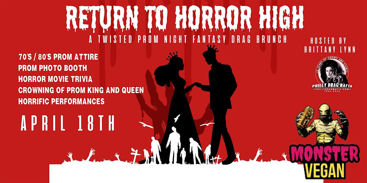 Let's go back to the halls of Horror High School! Don your best 70's and 80's Prom Fashions-take your prom photos at our photo booth, play horror movie trivia, crown our King and Queen of the Prom, see some fiendishly scary drag performances-all while watching Monster Vegan's cultivated collection of the best in horror from both cinema and tv on all our screens!