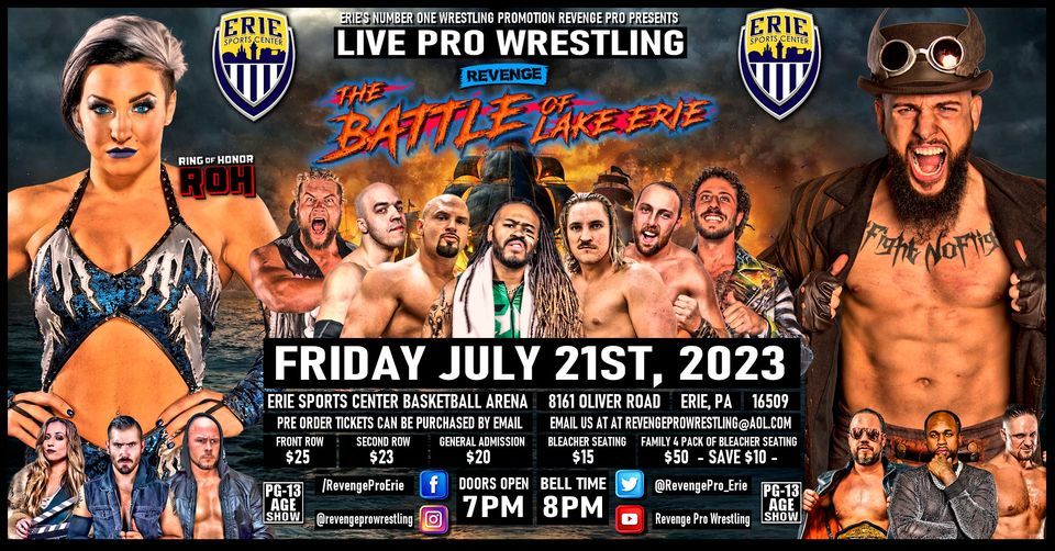 Erie's number one professional wrestling promotion returns to The Erie Sports Center Friday July 21st for The 2023 Battle Of Lake Erie! We're celebrating 5 years of Revenge at the best sport & entertainment venue in the city!We will crown the first ever Revenge World Tag Team Champions in a 4 Team Gauntlet Match! The Rip City Shooters vs Money Shot vs To Infinity & Beyond vs TME! "Big League" John McChesney will defend The Revenge World Title. You'll also see Bill Collier, Pretty Boy Smooth, Katie Arquette, Daniel Eads, Andrew Palace, Aaron Draven, & The Revenge return of Pretty Proper - Victor Benjamin & ROH / AEW Star Lady Frost!