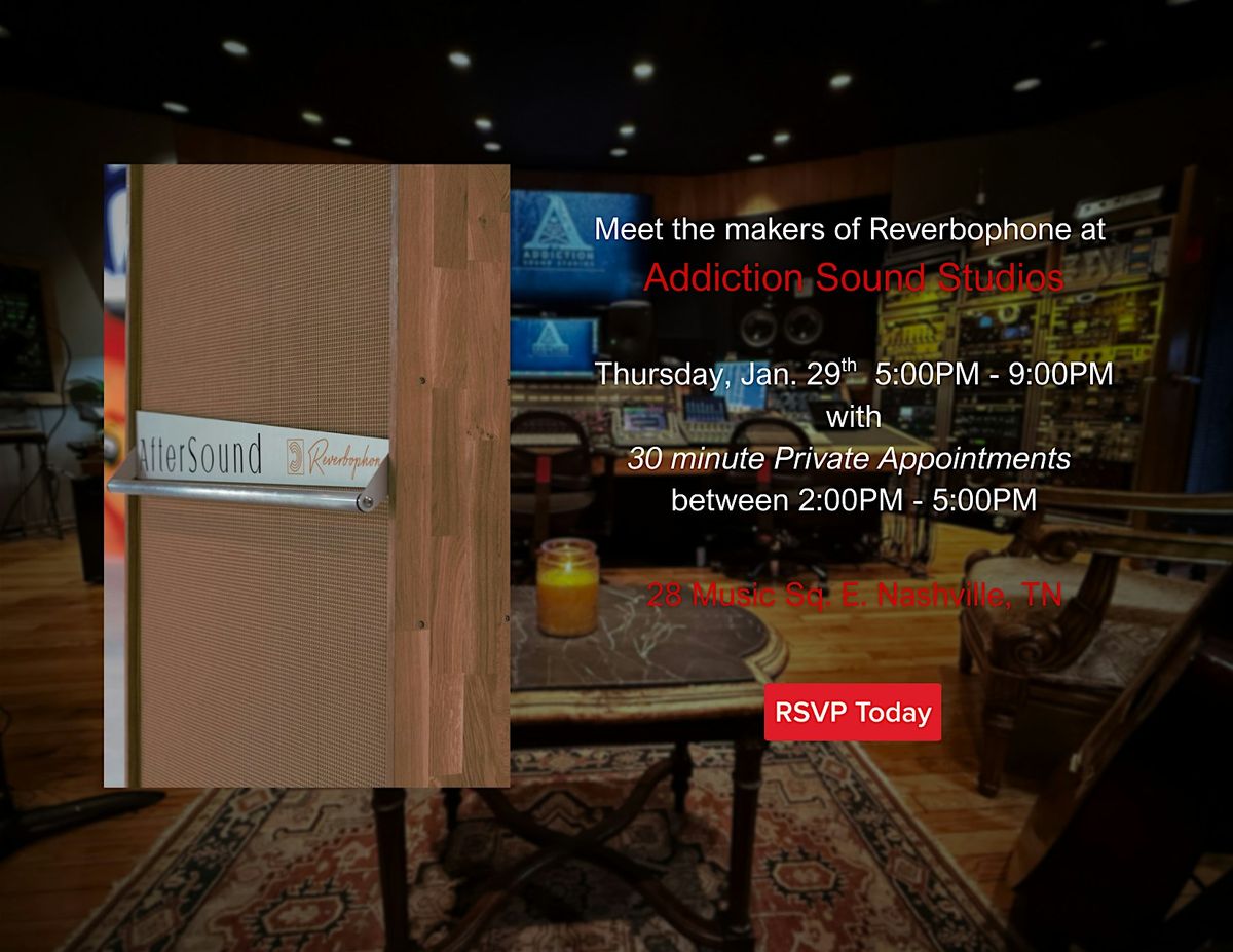 Come check out the awesome Reverbophone in action at Addiction Sound Studios' new Music Row Location. Food: Ladybird Taco & Two Boots Pizza. Drinks: Beer, Wine, & Sodas and meet the makers / owners of the company.