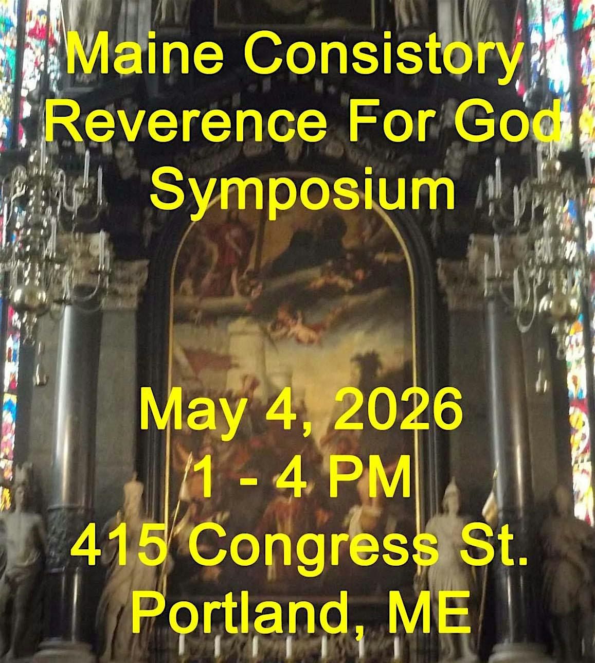 Reverence For God Symposium. Monday, 1-4 pm, May 4th, 415 Congress St. Portland, ME. Maine Consistory invites Maine Masons, their spouses, leaders of Maine houses of worship and religious educators to a discussion of two Core Values: “Reverence For God” and “Temperence” for the values and traditions of others. Perspectives of several religious bodies will be shared by religious leaders in this special event intended to promote civility by advancing a deeper understanding among people of different religions and faith traditions.