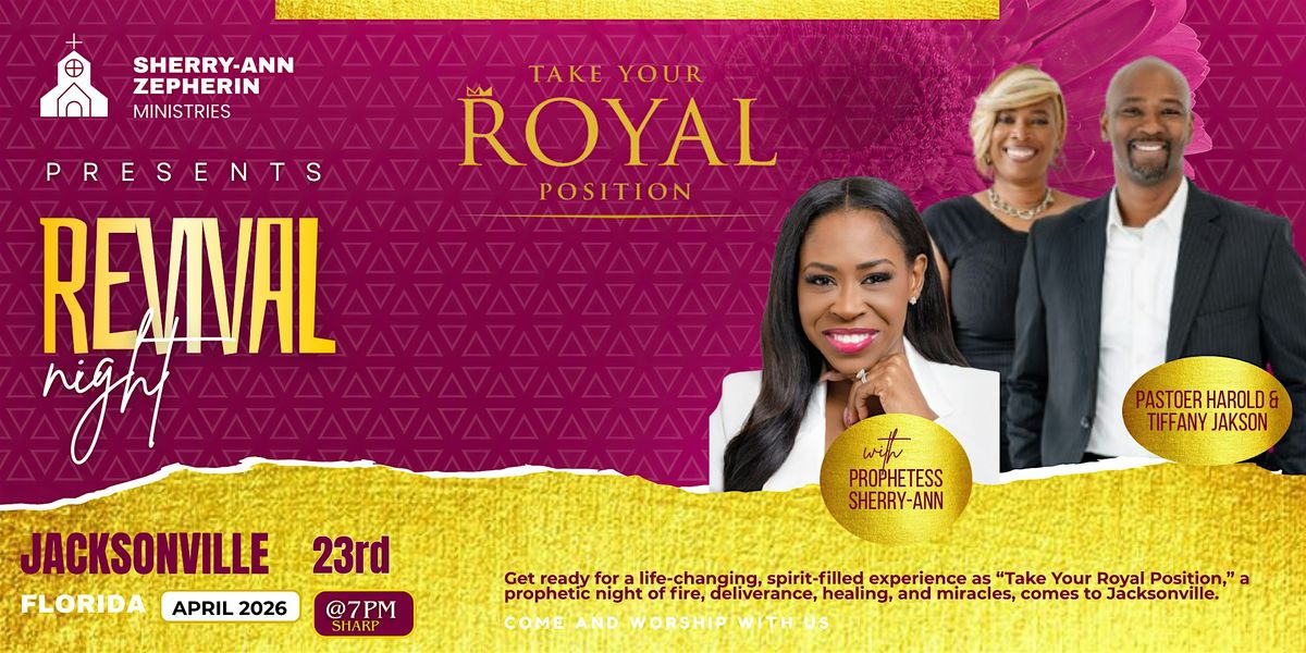 Join us in Jacksonville for "Take Your Royal Position," a powerful, prophetic night of fire, deliverance, healing, and miracles. Sherry-Ann Zepherin Ministries, in partnership with Compass Worship Ministries, invites you to experience life-changing ministry and spiritual renewal. Bring your family and friends; you wonβt want to miss this!