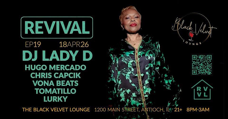 ***REVIVAL returns Saturday, April 18th at Black Velvet Lounge in Antioch, IL for another night built around what actually matters: the dancefloor.We’re bringing in the Queen of Chicago House Music, DJ Lady D. She’s a luminary in the electronic dance music scene, born and bred in Chicago. Her eclectic style, big smile, and skills in the booth always connect with audiences. Lady D plays clubs and festivals all over the world, and we’re excited to have her up close with the REVIVAL faithful. Support comes from guest Hugo Mercado alongside the REVIVAL crew: Chris Capcik, Tomatillo, VONA BEATS, and LURKY. Expect a proper mix all night: different styles, shared roots, and a steady groove from open to close. Each set brings its own flavor to keep the floor moving.Black Velvet Lounge is exactly the kind of room this night is meant for: intimate, focused, and built for sound.IYKYK. If you don’t, now’s a good time to find out. Because the real show isn’t on stage, it’s on the dancefloor.