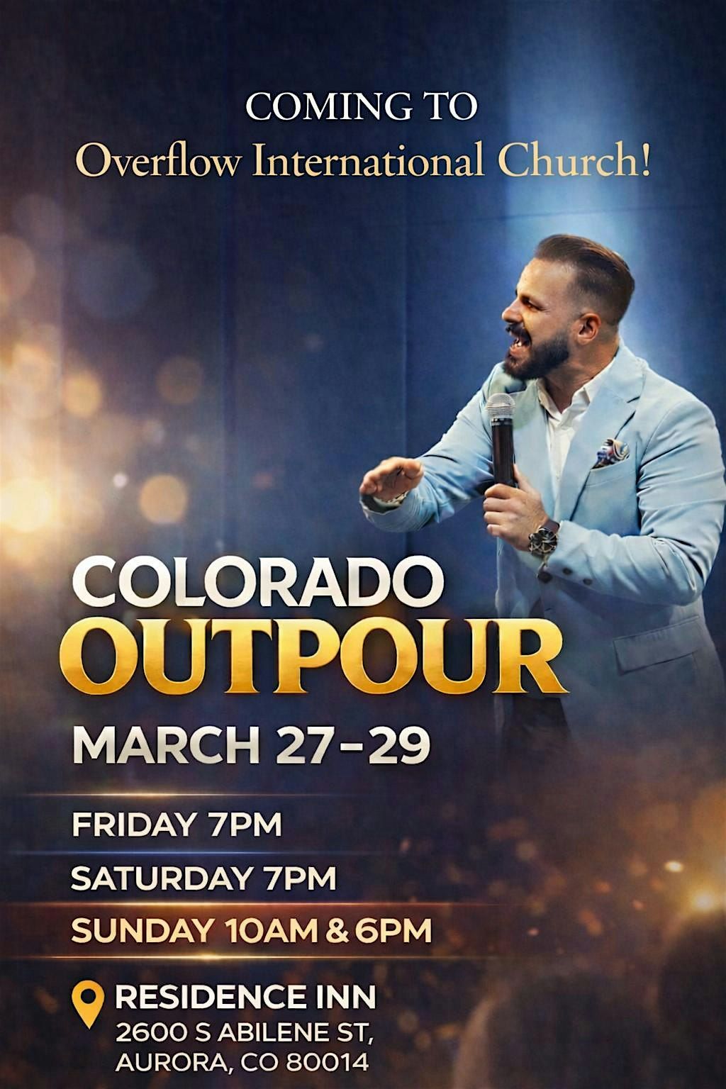 Get ready for a powerful, uplifting, encounter with God that’ll ignite your spirit and leave you changed forever. Wessel Du Bruyn brings the power of the Holy Ghost and Fire to Aurora, Co March 27-29. Services are: Fri 7pm, Sat 7pm, and Sun at 10am and 7pm.