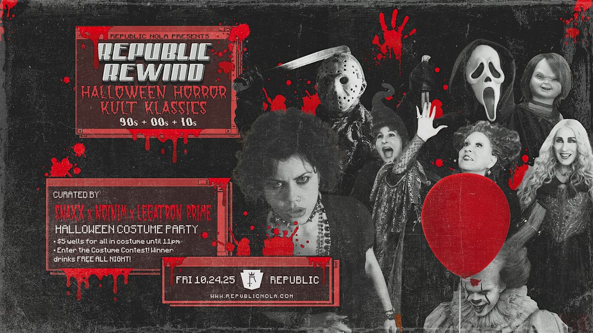 CALLING ALL FINAL GIRLS, GHOSTS, AND GHOULS OF THE 1990s, 2000s, and 2010s — Join us for REWIND: HALLOWEEN HORROR KULT KLASSICS edition on FRIDAY, 10.24! Relive the golden age of teen slasher films on the big screen with all the best clips from “Scream” and “Hocus Pocus” to “It” and “Chucky”! All while screaming along to the biggest bangers of the 90s, 00s, and 10s curated by SNAXX, NOINIM, and LEGATRON PRIME - expect “Toxic” by Britney, “Thriller” flashbacks, and pop hits so good they’ll haunt you forever. Come dressed to slay (literally) for $5 wells until 11PM and enter the retro halloween costume contest for a shot at FREE drinks all night. Don’t ghost this one — it’s going to be bloody iconic!