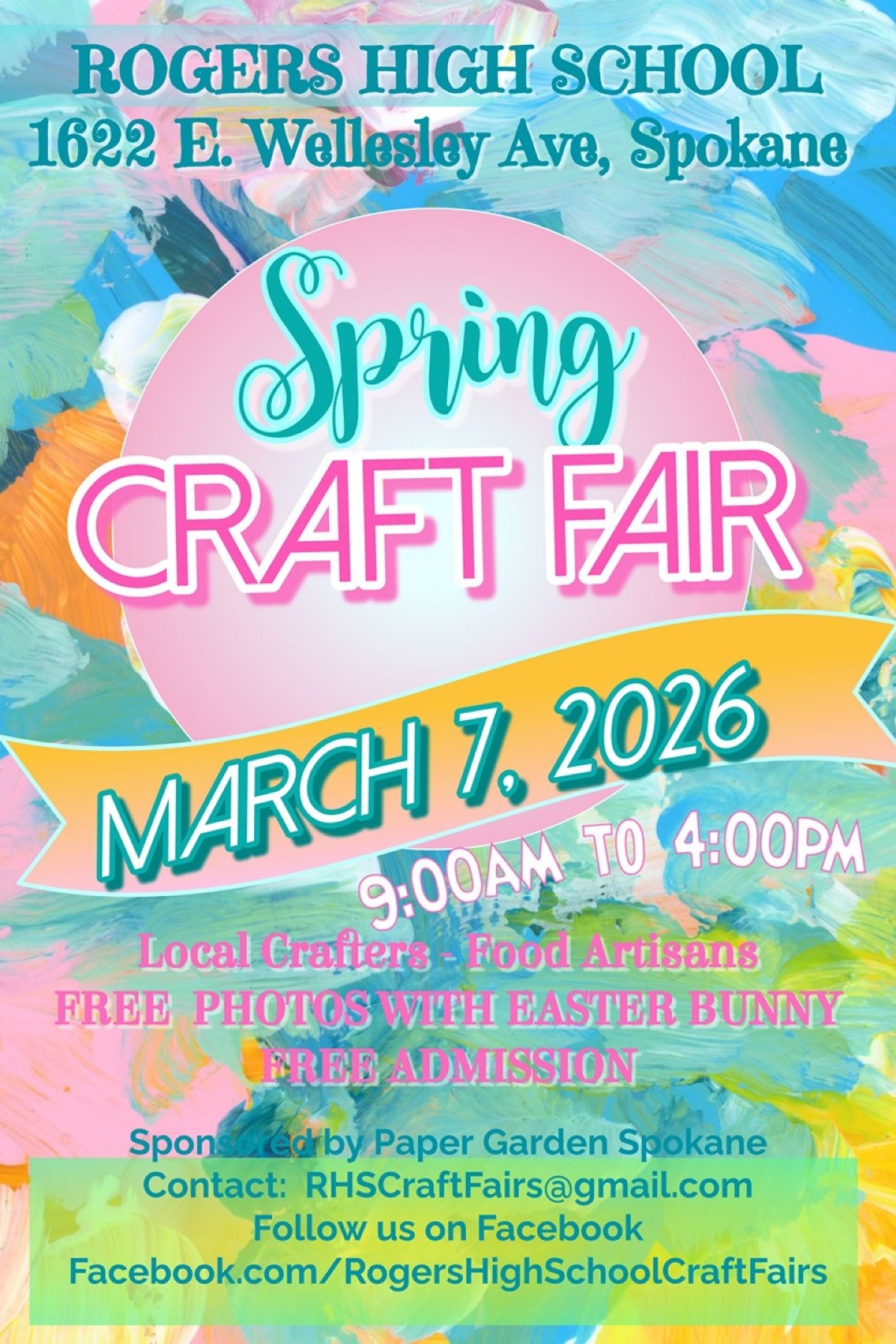 Easter is just around the corner! Join 90+ local crafters and food artisans for the RHS 2026 Spring Craft Fair. Over 40 NEW vendors to this year's event with fresh, new ideas to spruce up your home and garden or to give as gifts. We will be at Rogers High School, 1622 E. Wellesley Ave, Spokane on Saturday, March 7 from 9:00am to 4:00pm. FREE photos with the Easter Bunny from 10am to 3pm in the cafeteria. NO ADMISSION FEE!! Concessions by the RHS Booster Club.