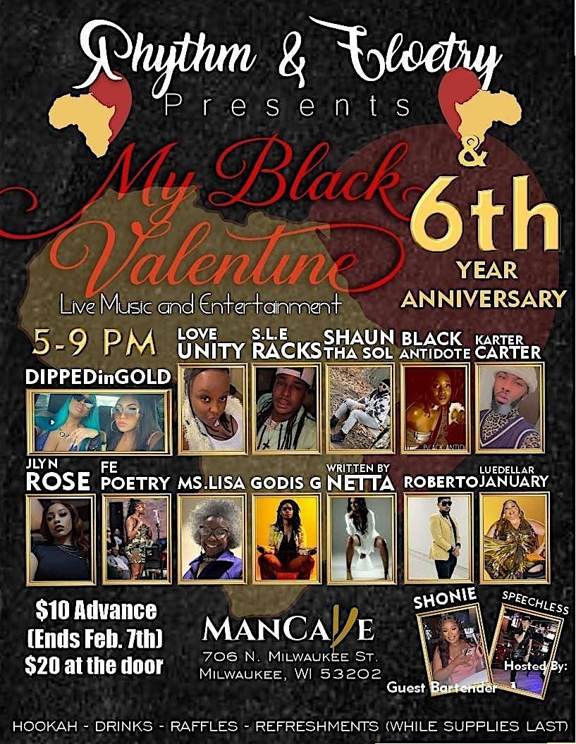 Welcome to Rhythm & Floetry : My Black Valentine happening at ManCave Milwaukee on February 15, 2026 at 5:00 PM (Central Time)! Get ready for a night filled with soulful beats and poetic vibes. Join us for a celebration of Black love and creativity. Let's groove to the rhythm and feel the flow of spoken word. Don't miss out on this special event! See you there!