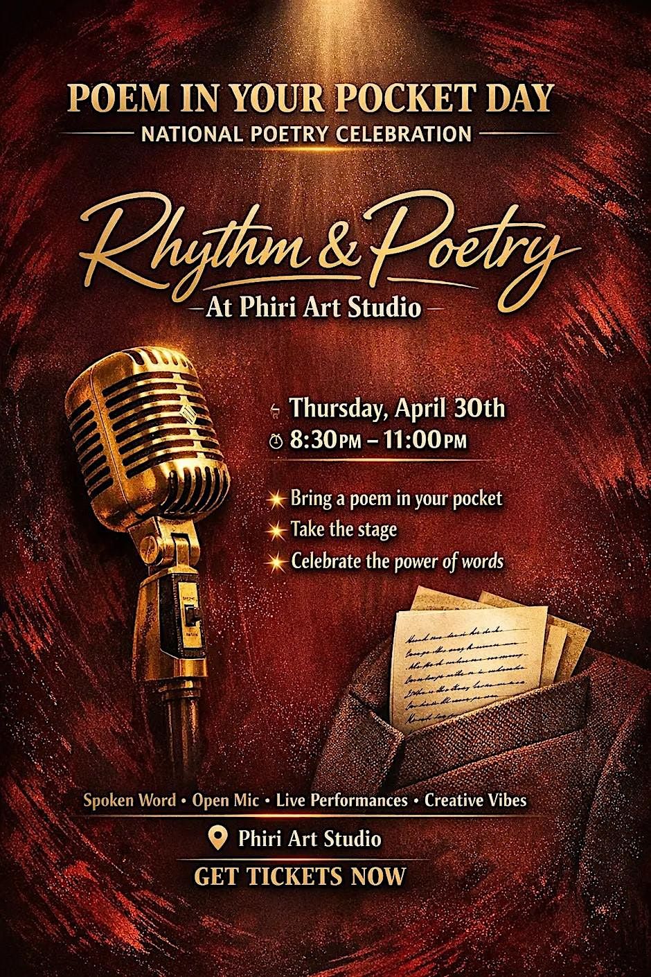 RHYTHM & POETRY At Phiri Art Studio π Thursday, April 30th β° 8:30 PM β 11:00 PM π Phiri Art Studio β¨ Bring a poem. β¨ Share your voice. β¨ Celebrate creativity. Spoken Word β’ Live Performances β’ Open Mic Vibes β’ Community Energy π GET YOUR TICKETS NOW
