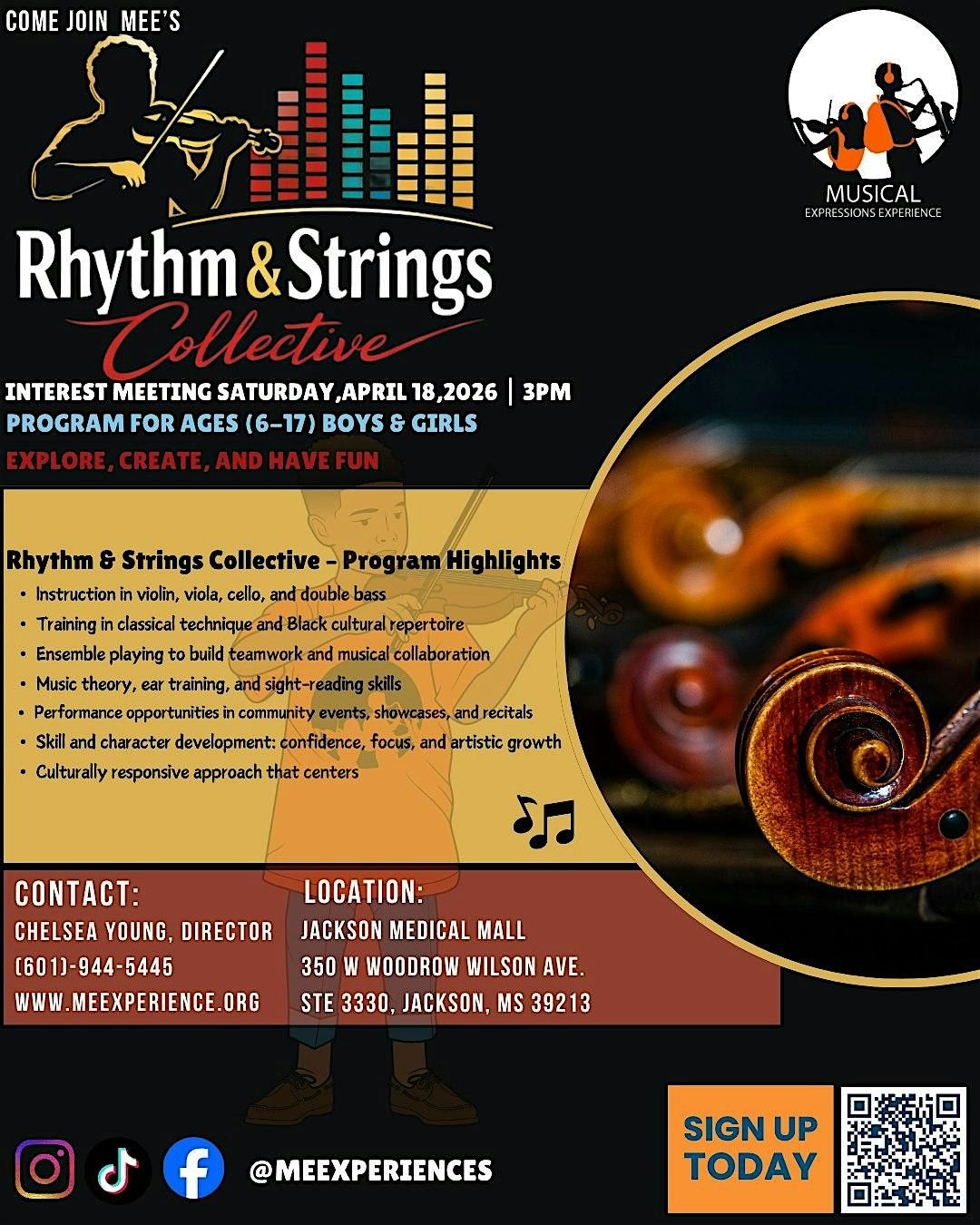 Give your child the opportunity to learn, perform, and grow through music! Join Musical Expressions Experience for an exciting Rhythm & Strings Interest Meeting, where students can explore our dynamic Strings Program and Rhythm & Divine Percussion Program.