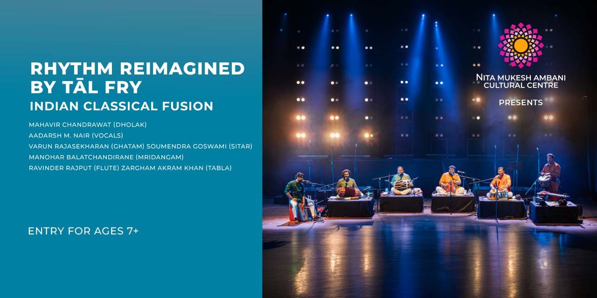 When rhythm takes center stage, melody rises to meet it. This Indian Classical Fusion evening features TĀL FRY—a true collective of seven accomplished artists, in a dynamic journey through sound shaped by deep tradition and bold experimentation. The ensemble, which includes Aadarsh (Carnatic vocalist), Mahavir Chandrawat (dholak), Varun Rajasekharan (ghatam), Soumendra Goswami (sitar), Manohar Balatchandirane (mridangam), Ravinder Rajput (flute), and Zargham Akram Khan (tabla), collectively navigate the layered architecture of Indian classical rhythm, weaving together Carnatic and Hindustani traditions with folk influences and modern textures.