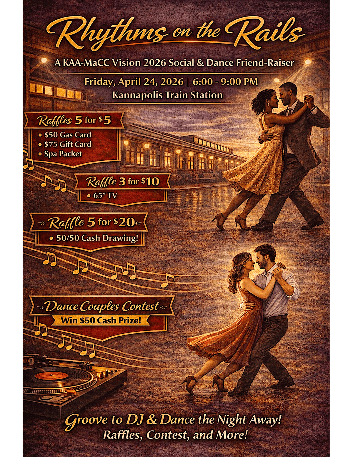 Join KAA-MaCC at the Kannapolis Train Station for a night of dancing, raffles, and friendly competition—all in support of building relationships and advancing KAA-MaCC’s Vision 2026 initiative. Come for the rhythms, stay for the community, and help move the vision forward.