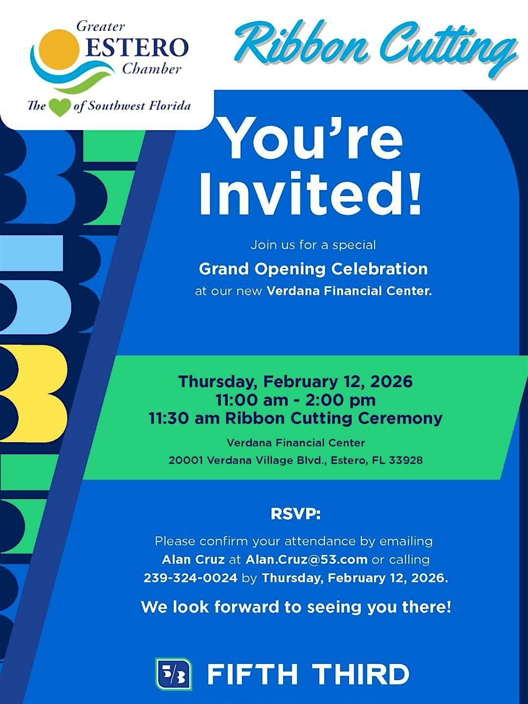 The Greater Estero Chamber of Commerce is pleased to invite the community to a Ribbon Cutting for Fifth Third Bank in Verdana! Join us as we celebrate this exciting new location and welcome Fifth Third Bank to the Estero business community.