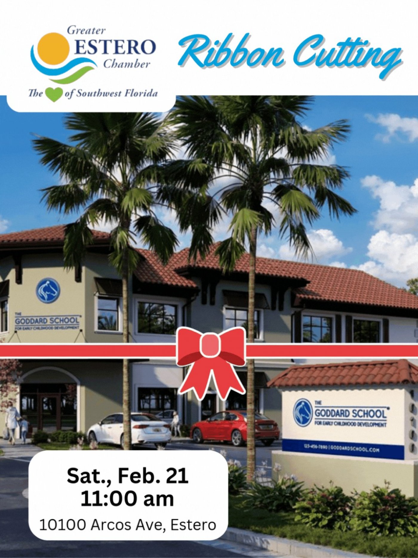 Join us as we celebrate the Ribbon Cutting for The Goddard School in Estero. The celebration begins at 11:00 am on Saturday, February 21 at their location at 10100 Arcos Ave, Estero, FL.