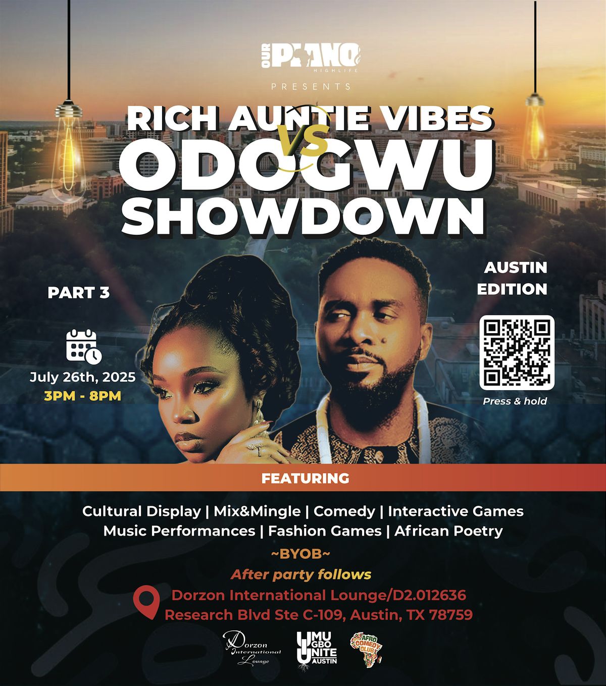Following successful editions in other cities, the iconic Rich Auntie Vibes vs Odogwu Showdown lands in Austin for Part 4! This culturally immersive day event celebrates African excellence, creativity, and community through vibrant showcases and entertainment.