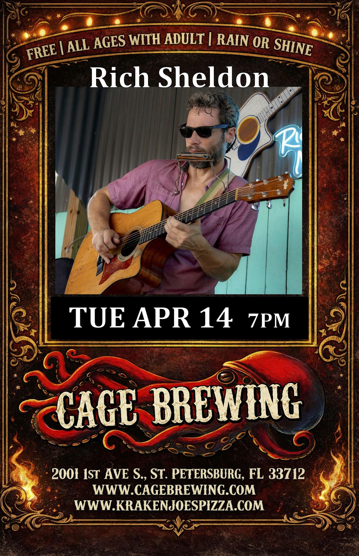 Come join us for a night of music with Rich Sheldon of the Rich Sheldon Band at Cage Brewing! Get ready for an evening filled with great tunes and good vibes. This event is free entry, so bring your friends and let's have a blast together. See you there!