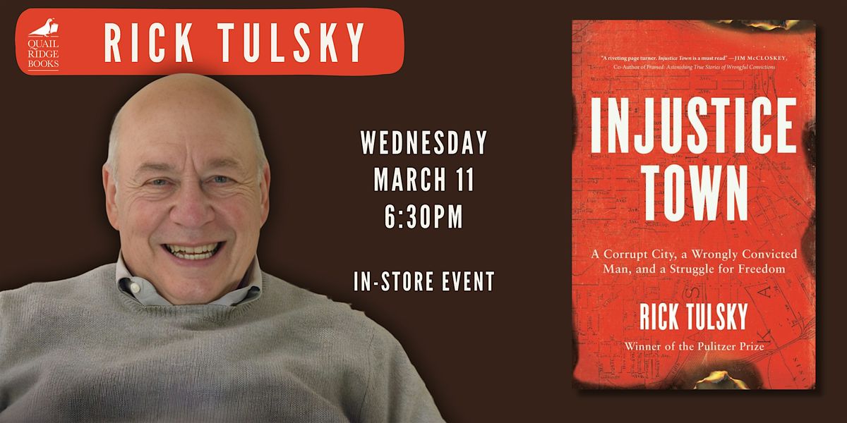 Tickets include a copy of Injustice Town, guaranteed entry to the event, and a seat in the reserved section. Rick will sign books after the program.