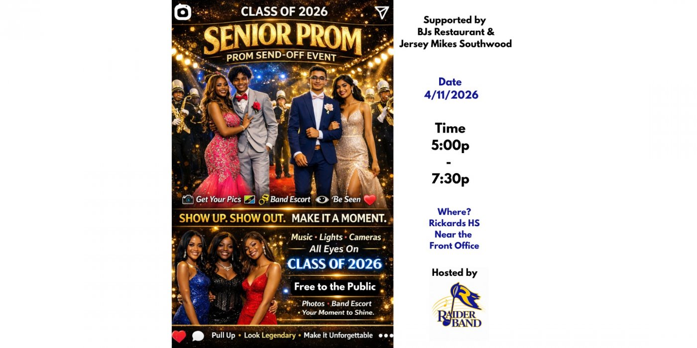 You’re invited to celebrate our students in style! Join us for the Rickards High School Prom Send-Off—a special community event filled with elegance, excitement, and unforgettable moments. This event is free and open to the public, so come out, show your support, and help us send our students off to prom in a big way. We look forward to seeing you there! ✨