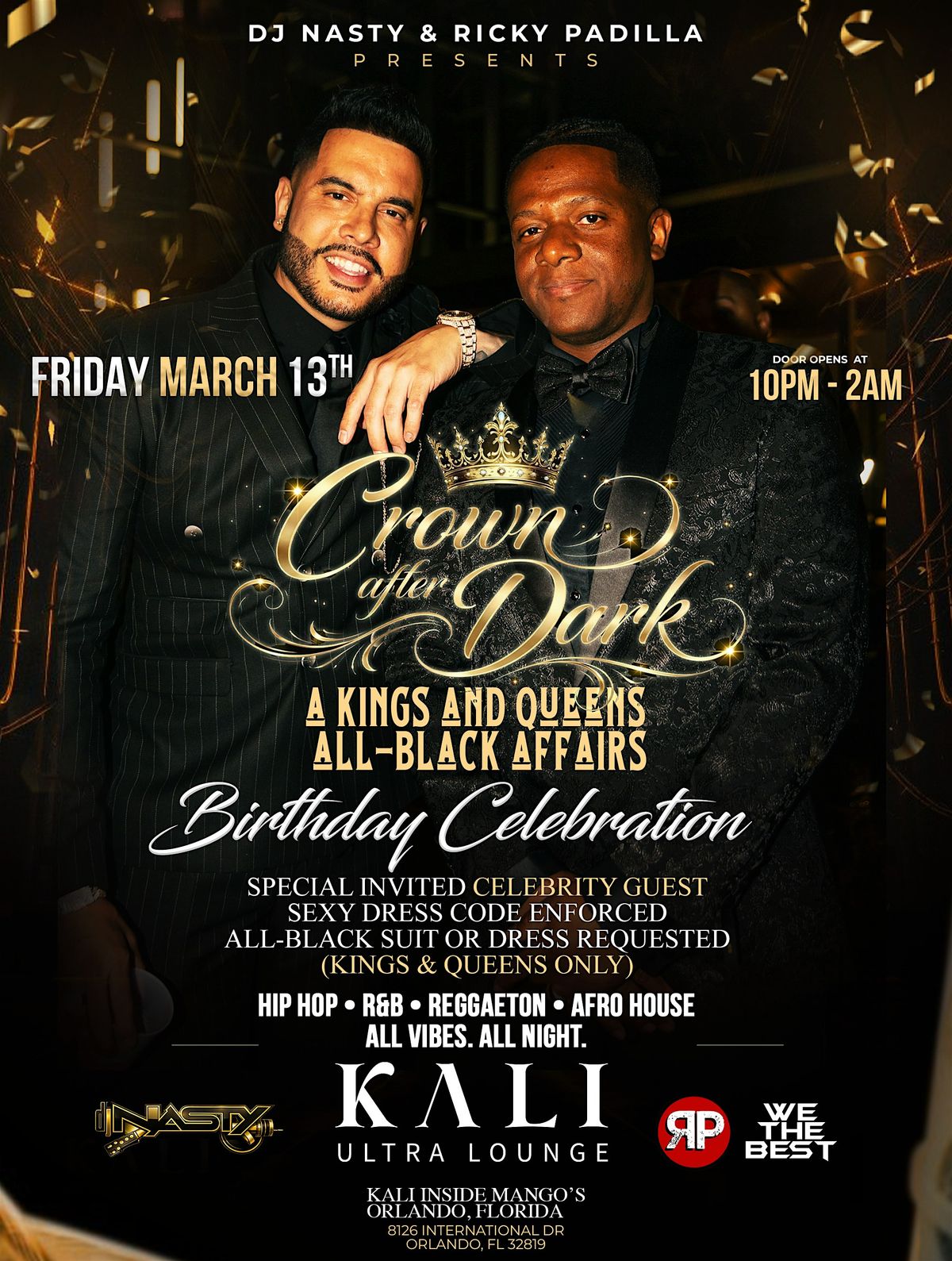 Get ready for an unforgettable night with Ricky Padilla and DJ Nasty celbrating their bdays. Another themed evening where guest dress smartly in black for a night life experrience featuring music, food, good people, and nonstop fun. ALL BLACK AFFAIR – it's the place to be. Kali is located next to mangos.It has its own entrance.