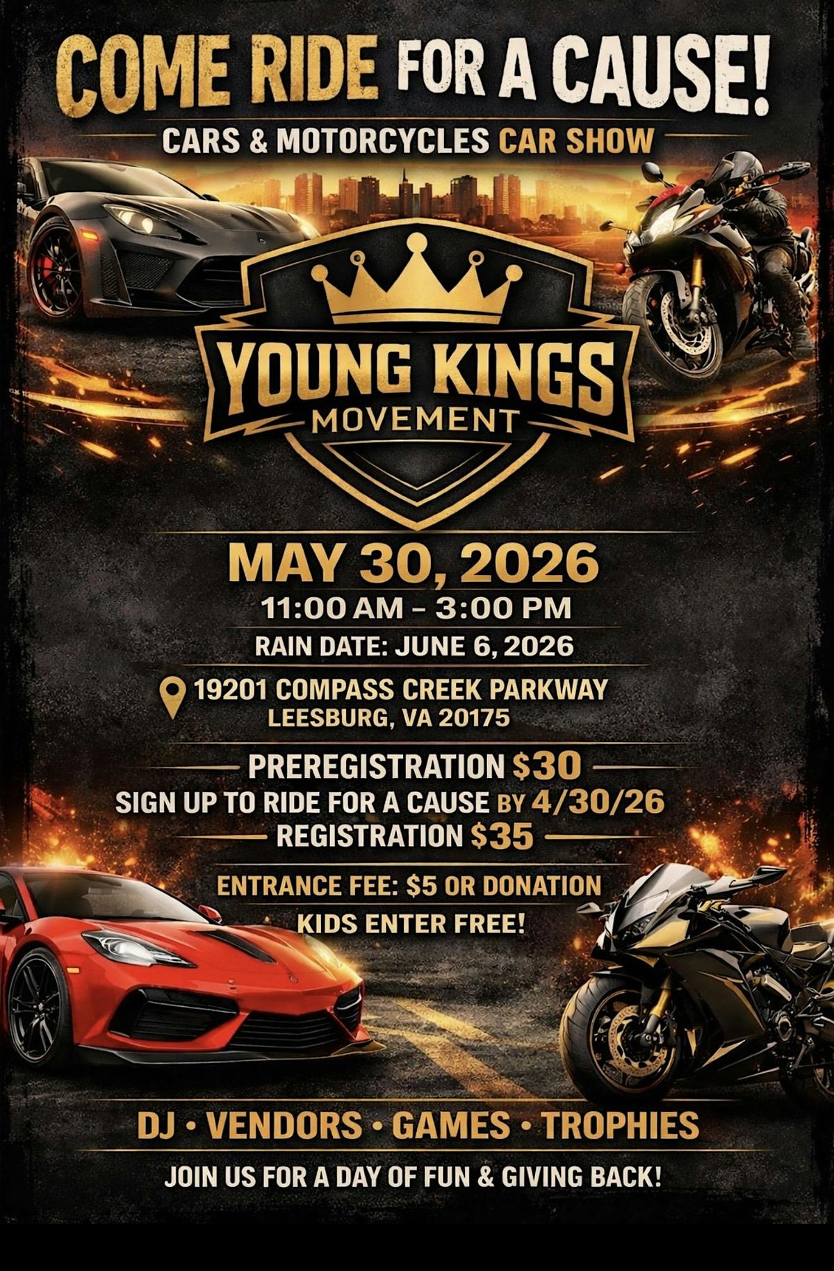 Join Young Kings Movement for Ride for a Cause, a high-energy Cars & Motorcycles Car Show bringing together vehicle enthusiasts, families, and supporters for a day of fun and community impact.