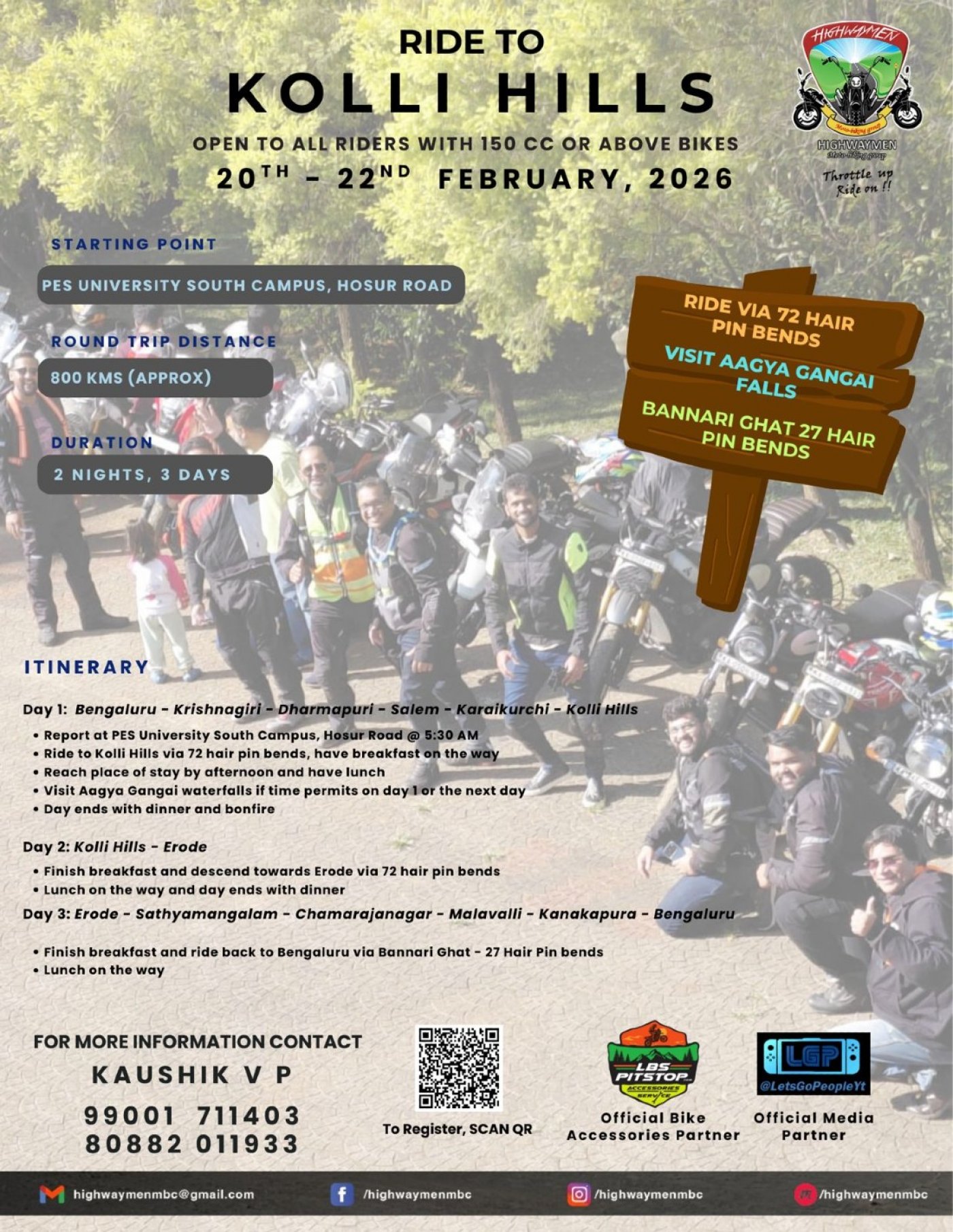 - Finish breakfast and ride back to Bengaluru via Bannari Ghat - 27 Hair Pin bends