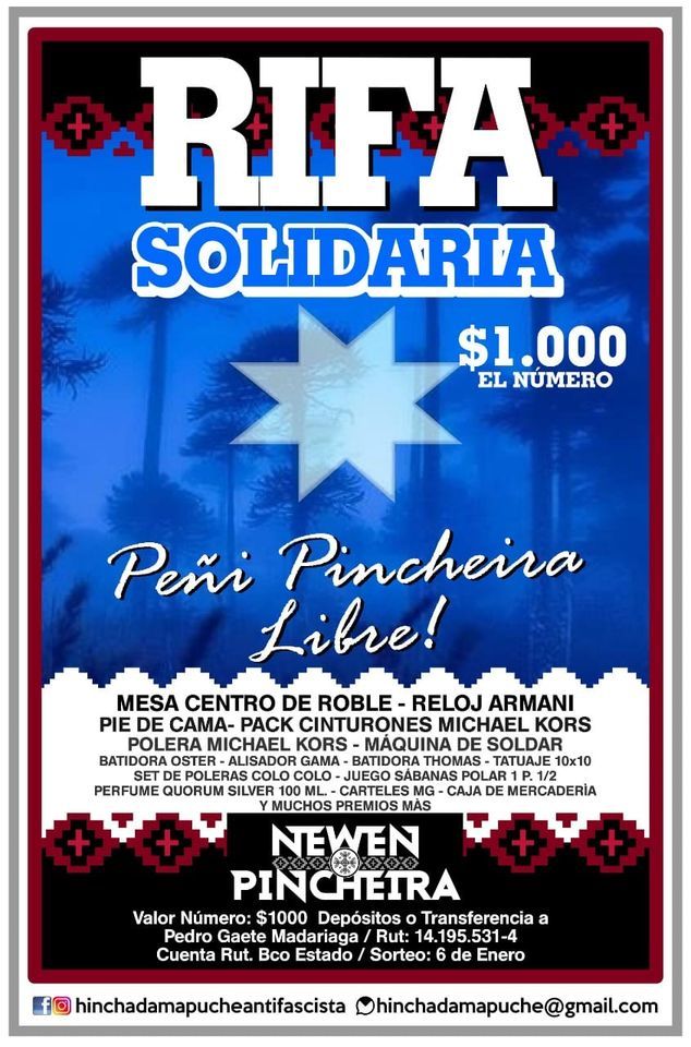 Esta rifa constará de diversos premios, tales como un Living pie de cama una Mesa de Madera (Trabajo realizado por un peñi P.P.M ) Maquina de soldar, un Reloj, y muchos otros premios más a sortear! Su valor será de tan solo $1.000 pesos. Para comprar números deben comunicarse a Instagram y Facebook de Hinchada Mapuche Antifascista. El sorteo se realizara el viernes 6 de enero.