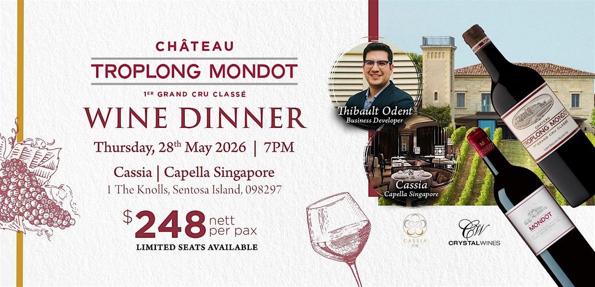 An evening dedicated to the richness and depth of Chateau Troplong Mondot, one of Saint-Emilion’s most distinguished estates. Hosted by Thibault Odent, this intimate dinner at Cassia, Capella Singapore pairs a refined Cantonese menu with a compelling lineup of vintages—showcasing the estate’s signature intensity, structure, and evolving elegance. A rare exploration of Right Bank Bordeaux at its most expressive.