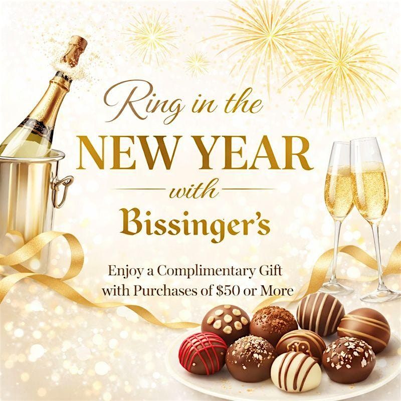 Get ready for a sweet start to the year! Join us in person on the 6th floor Bissinger's Shop to celebrate and indulge in the decadent flavors of Bissinger's Chocolate. It's the perfect way to welcome the New Year's with friends, fun, and fabulous treats. Don't miss out on this delicious experience including an apple cider toast—With your purchase of $50 Bissingers Chocolates recieve a free two-piece box set of our Dark Chocolate Champagne Truffle. While Supplies Last, During Event Only