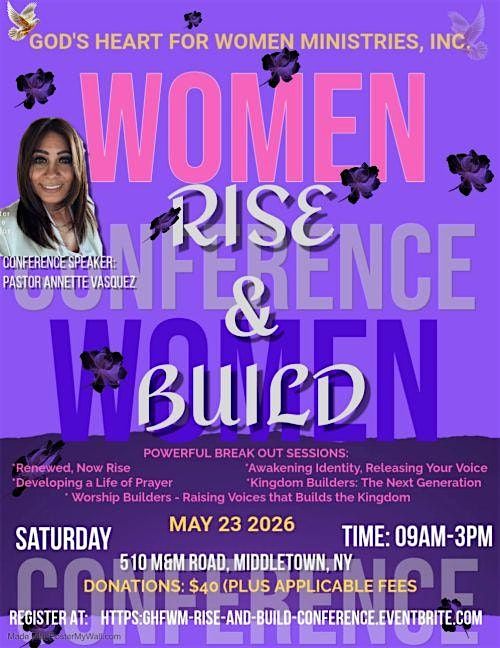 God’s Heart for Women Ministries is requesting your presence at Rise and Build. A divine invitation to step into a greater purpose, to embrace your God given assignment, and live a life of impact for His Kingdom.