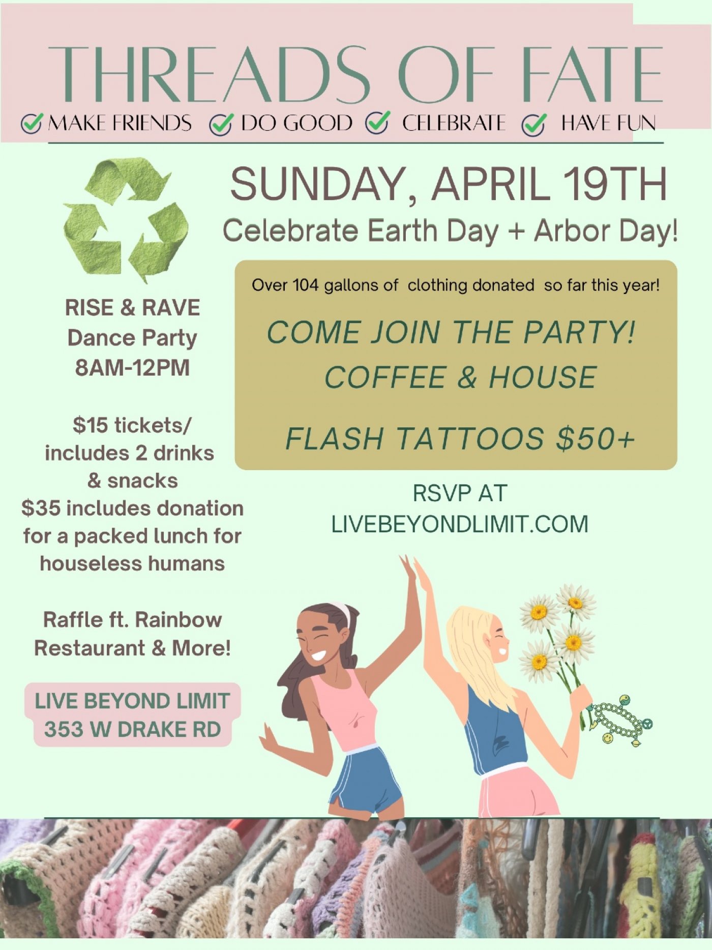 Threads of Fate Events brings you another way to have fun, make friends, and give back to the community! Rise & Rave with us on Sunday morning from 8am to 12pm. $15 gets you into the party with breakfast snacks and two drinks. $35 provides a $20 donation to create packed lunches for houseless people in Denver. Flash Earth Day & Arbor Day tattoos start at $50! Join us for our Giveaway! Celebrate with us! RSVP today!