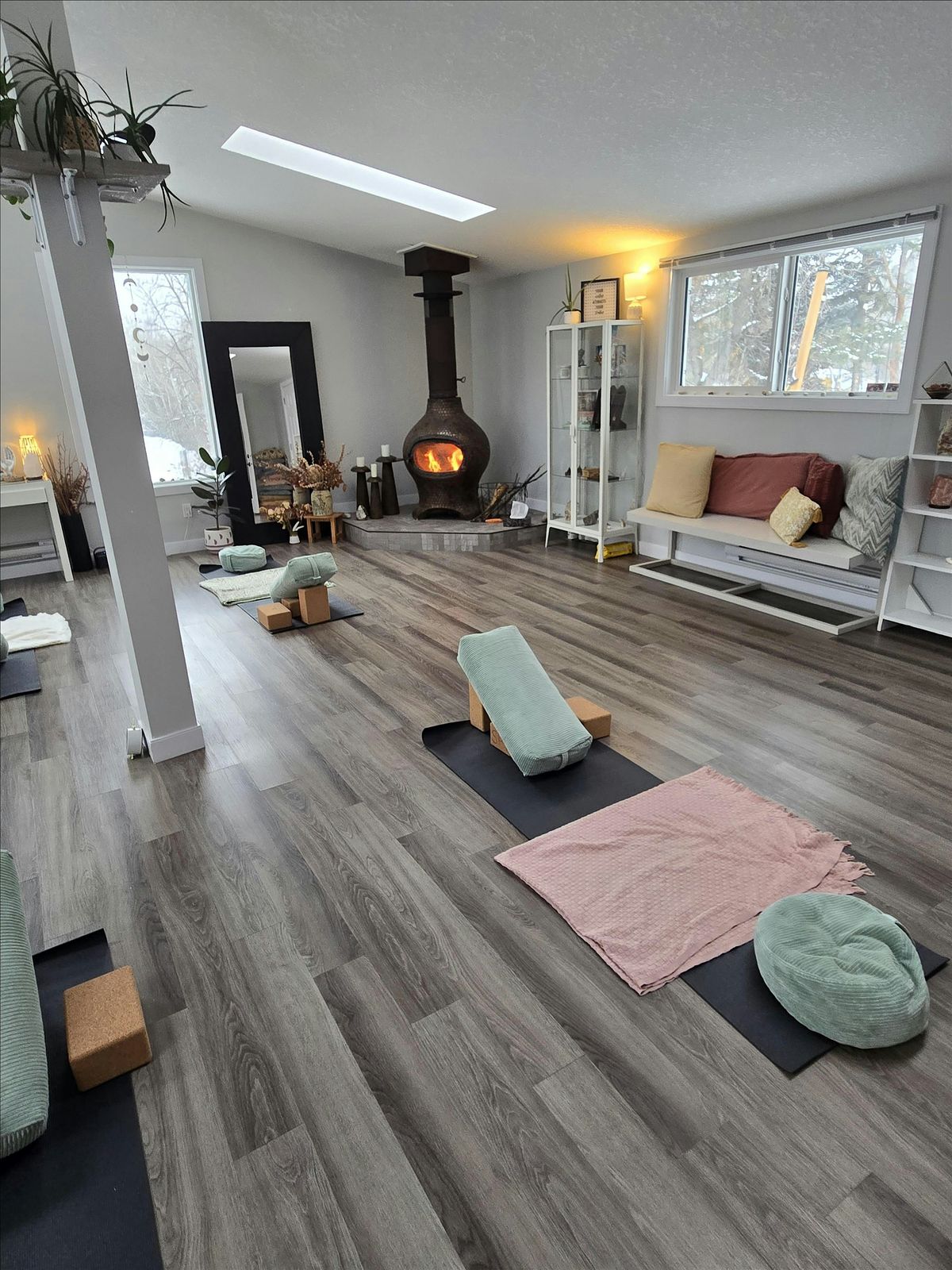 We gather at Rising Moon Studio, a beautiful, intimate space with a cozy fireplace to welcome you on cooler mornings.