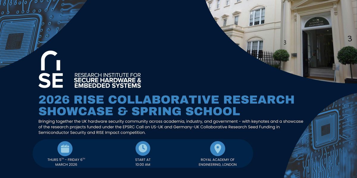 We are delighted to invite you to the RISE Collaborative Research Showcase & Spring School. The aim of this event, which is being supported by UK Department for Science, Innovation and Technology (DSIT), is to showcase the research projects funded under the EPSRC Call on US-UK and Germany-UK Collaborative Research Seed Funding in Semiconductor Security in addition to our RISE Impact competition projects.