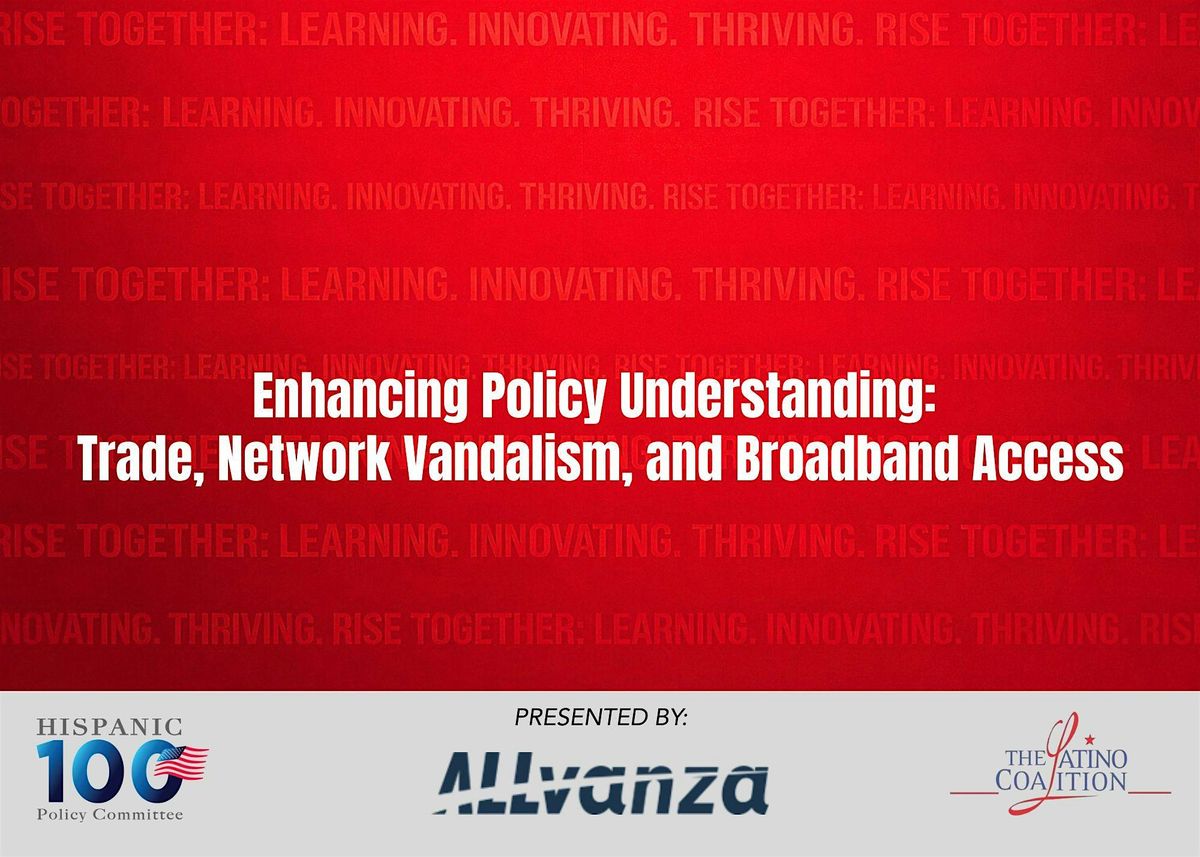Join ALLvanza, Hispanic 100 Policy Committee and The Latino Coalition for an educational policy discussion featuring experts and thought leaders who will share insights on critical issues shaping the current year and the years ahead. The discussion will deepen understanding of trade and the USMCA, highlighting how the right trade frameworks can drive innovation, support American businesses, and deliver benefits to communities nationwide. The panel will also address the escalating threat of network vandalism and the pressing need to protect the critical infrastructure that supports our economy, emergency services, businesses, and the everyday communications on which Americans depend. Our speakers will also provide guidance on how Broadband Equity, Access, and Deployment (BEAD) Program funds can be allocated to expand broadband access. This event provides a timely opportunity to educate policymakers on these issues and their impact on all Americans.