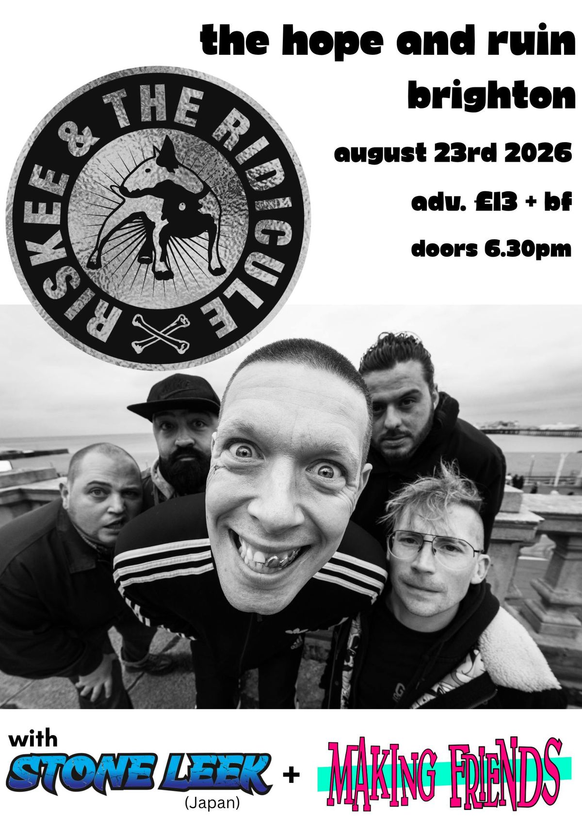 We're stoked to bring the South East's Grime Punk legends Riskee and the Ridicule to Brighton. Joined by Stone Leek melodic-hardcore from Kyoto, Japan and local skatepunks Making Friends.Disclaimer: