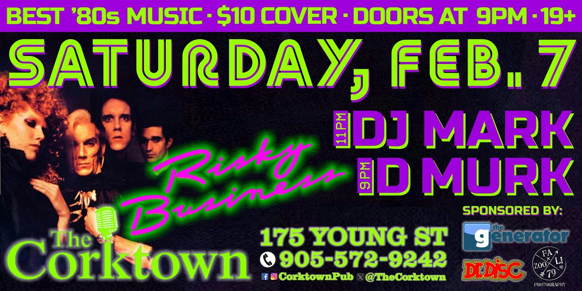 Risky Business '80s Night takes place every first Saturday of the month at The Corktown Pub. Doors open at 9:00pm; 19+. FREE retro candy and party favours while supplies last. The kitchen is open late with a full menu. In-house photography by #JulieFazooli and custom-scented "super citrus" fragrance created by Kate who is also our greeter at the door. The area's most popular and longest running '80s retro night, since 2014!